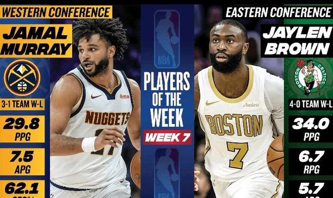 公布球队实力榜的同时,NBA官方还公布了上周的周最佳球员;其中西部正是由掘金二当家贾马尔-穆雷当选,而东部由凯尔特人前锋杰伦-布朗当选。上周比赛里,贾马尔-穆雷共出战4场,场均得到29.8分7.5助攻,三分球命中率62.1%,率领掘金拿到3胜1负。杰伦-布朗共出战4场,场均贡献34分6.7篮板5.7助攻,率领凯尔特人4战全胜。